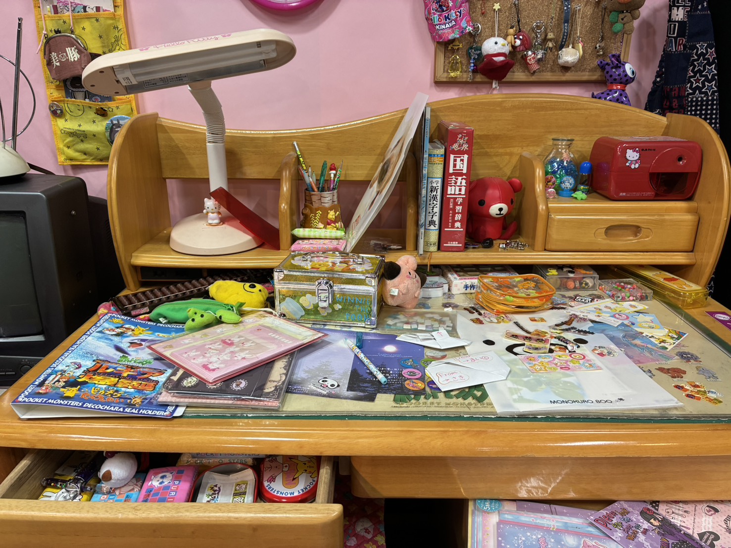 机横の棚には当時流行した少女漫画がずらり。その中になぜかロボット大戦の攻略本が紛れ込んでいて、これは兄弟から借りパクしたんだな…なんて勝手にこの机の持ち主について考えてしまいました。