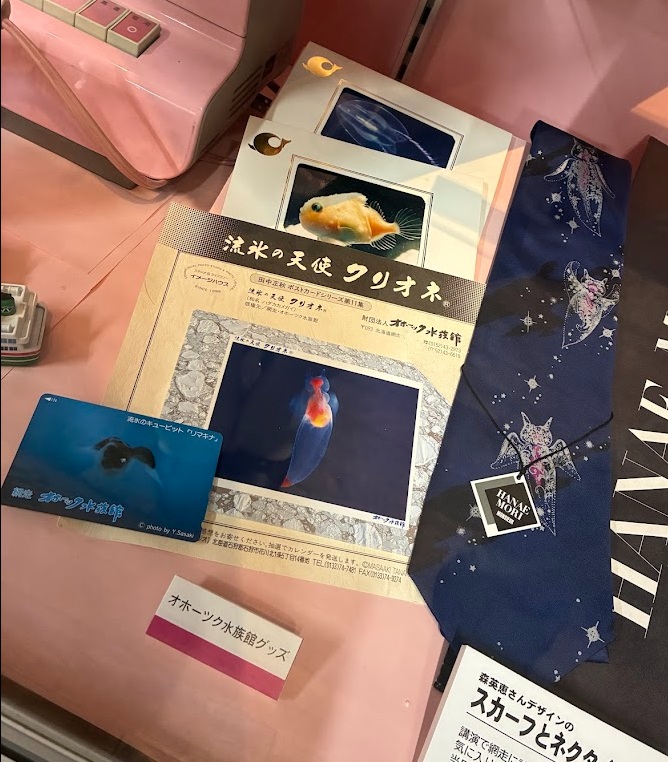 ちなみに写真右側 クリオネ柄のネクタイは世界的デザイナー森英恵さんが、来網した際に見たクリオネをデザインし水族館で2,000枚限定販売されたそう。とても貴重な品がこんなに綺麗に残っているなんですごいですね。